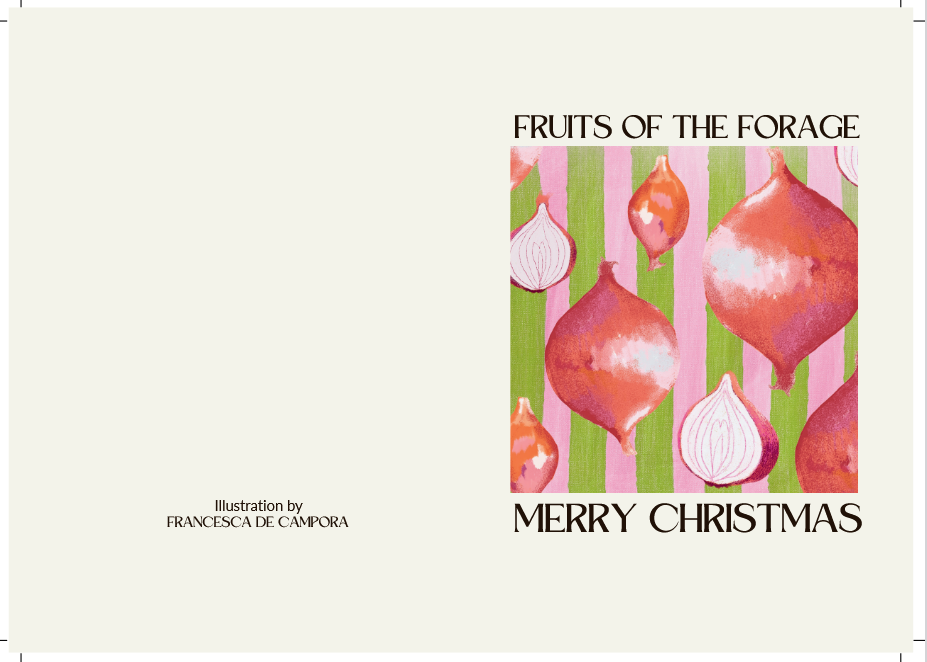 Our in house Artist, Francesca de Campora has designed some extra special illustrations of our favourite products. A6 card, lovingly designed - perfect to add to a hamper or giftbox. Message on the outside 'FRUITS OF THE FORAGE' 'MERRY CHRISTMAS', inside blank.
